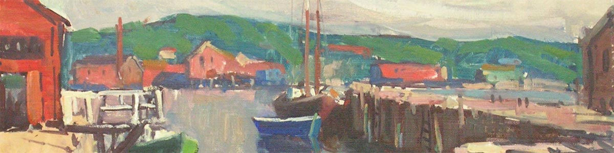 Alden Bryan (1913 – 2001) Originally from Missouri, Harvard-educated in economics, an avid sailor and tennis player, Alden Bryan married  Mary Taylor, a sculpture student, and a year later they sailed into Gloucester Harbor, providing them with their first glimpse of working landscape artists.